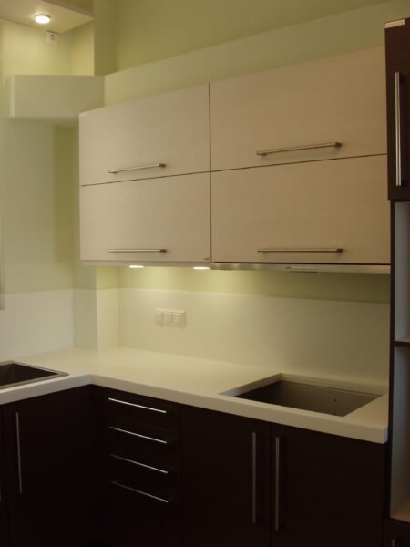 The entire layout was redesigned to maximize the potential of the space, transforming it into a contemporary home. The concept focused on utilizing the large entrance area effectively. A wall between the bedroom and part of the living room was removed to create a more spacious living room. The kitchen was designed to be adjacent to the living room.
