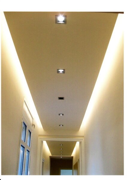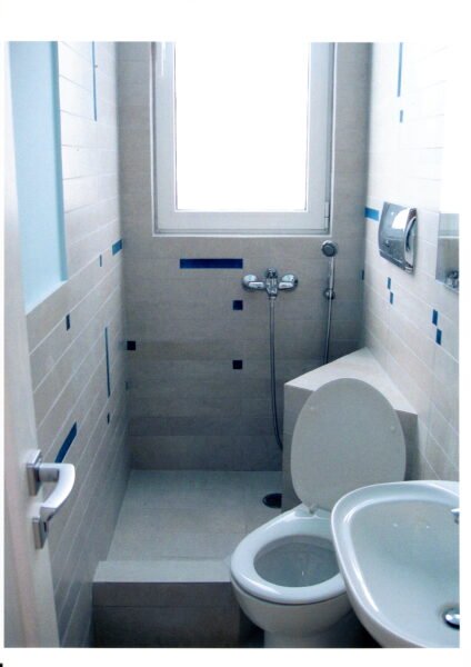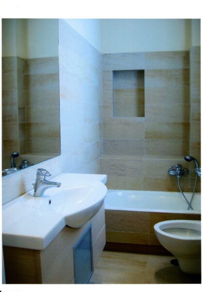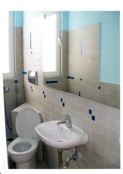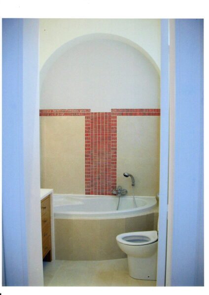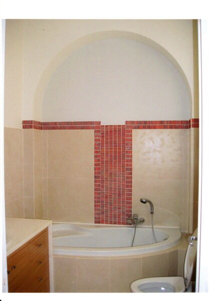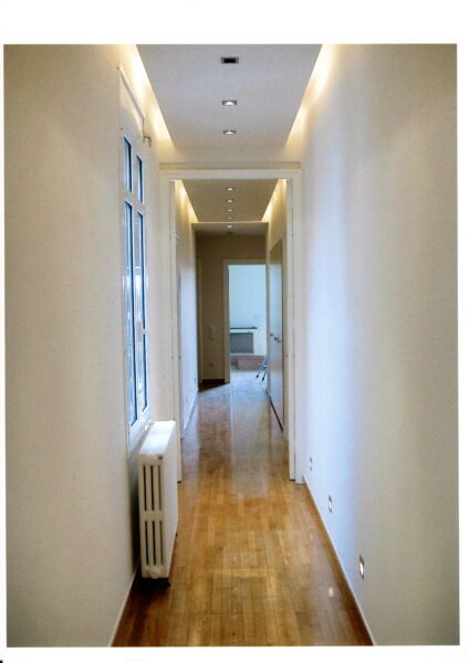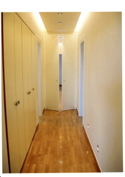 The kitchen underwent a complete renovation to create a spacious area, and the bathrooms were also updated. To conceal electrical and mechanical ductwork, plasterboards were installed on the ceiling of the long corridor. Additionally, the original oak wood floors and doors were restored, maintaining the apartment’s historical charm.